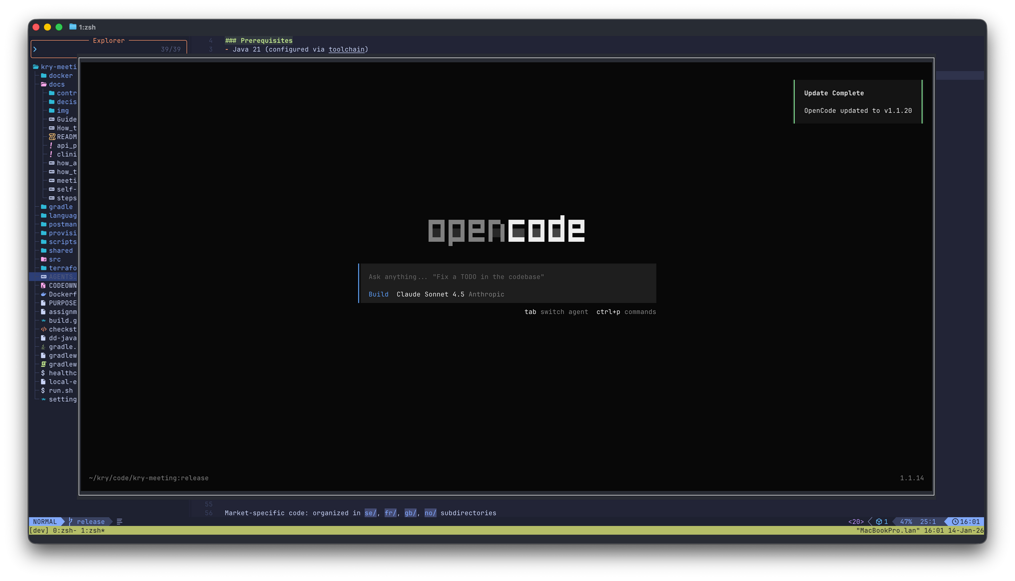 - What I Learned: I learned about opencode which is a TUI that sits in front of AI Agents. I set it up with Claude Code and had a play around with it. Using some tmux foo I was able to get it to popup over the top of neovim when coding. It looks and works really well. I still love coding in terminal as it gives me old school vibes and I like having the tools right alongside the code instead of in seperate apps, windows/browsers etc.